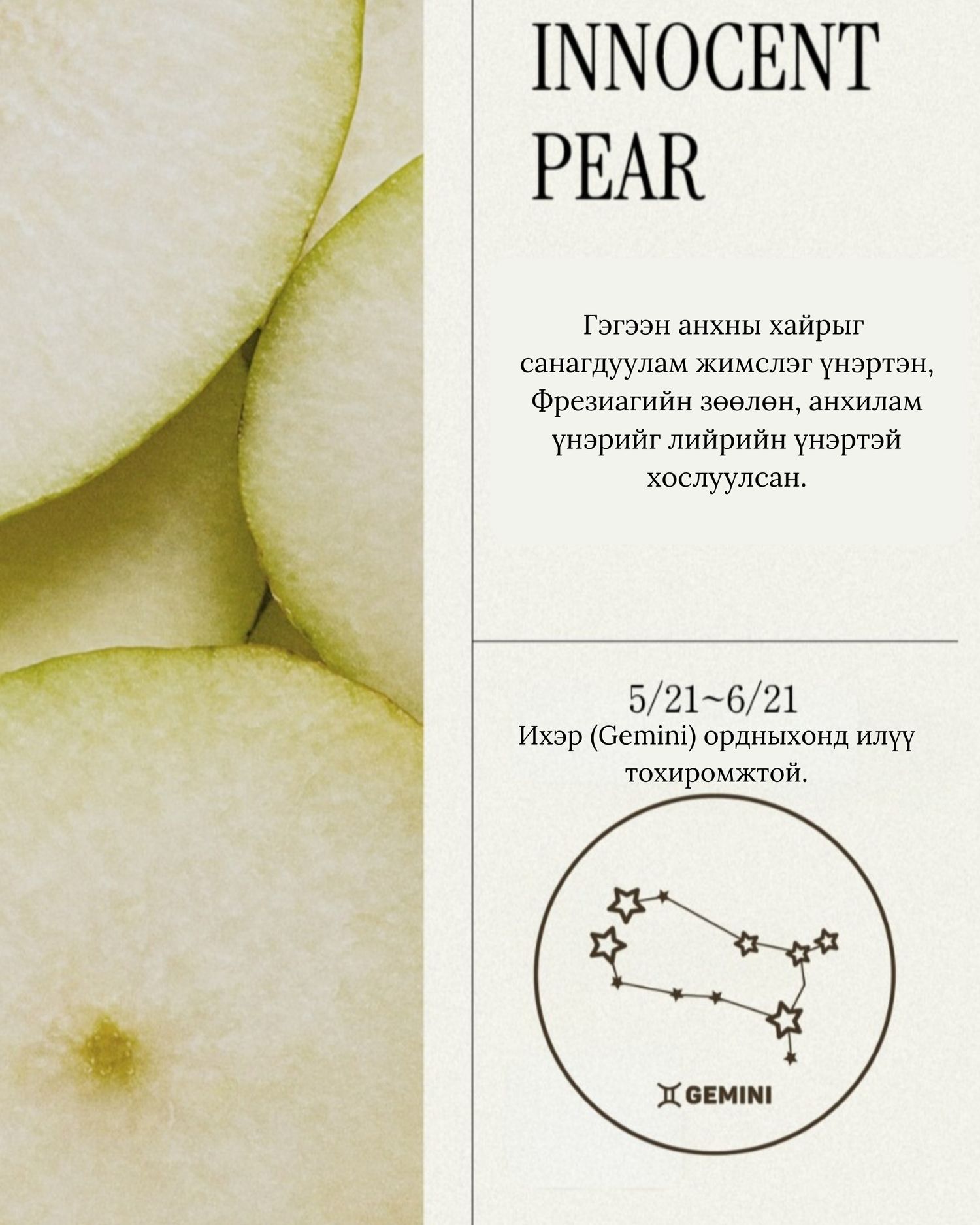 Тансаг үнэрт вeган гарын тос No.4 Innocent Pear- Зөөлөн фрезиагийн анхилуун, чихэрлэг лийрний холимог үнэр— цэвэр, анхны хайрыг тань санагдуулам жимсний үнэр